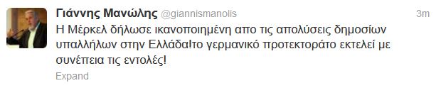 Πρωινές αιχμές από τον Γιάννη Μανώλη. Ο πρώην βουλευτής, μέσω του προσωπικού του λογαριασμού στο Twitter έγραψε ότι η «η Μέρκελ δήλωσε ικανοποιημένη από τις απολύσεις δημοσίων υπαλλήλων στην Ελλάδα…».