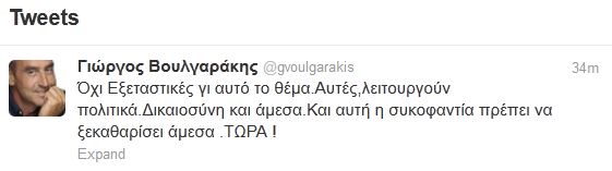 «Όχι Εξεταστικές γι αυτό το θέμα. Αυτές, λειτουργούν πολιτικά. Δικαιοσύνη και άμεσα. Και αυτή η συκοφαντία πρέπει να ξεκαθαρίσει άμεσα .ΤΩΡΑ!», γράφει στο Twitter ο Γιώργος Βουλγαράκης αναφορικά με την υπόθεση ξέπλυματος μαύρου πολιτικού χρήματος που αποκάλυψε η Real News.Ο κ. Βουλγαράκης ζητά την άμεση παρέμβαση της δικαιοσύνης προκειμένου, όπως γράφει να ξεκαθαρίζουν όλα άμεσα.