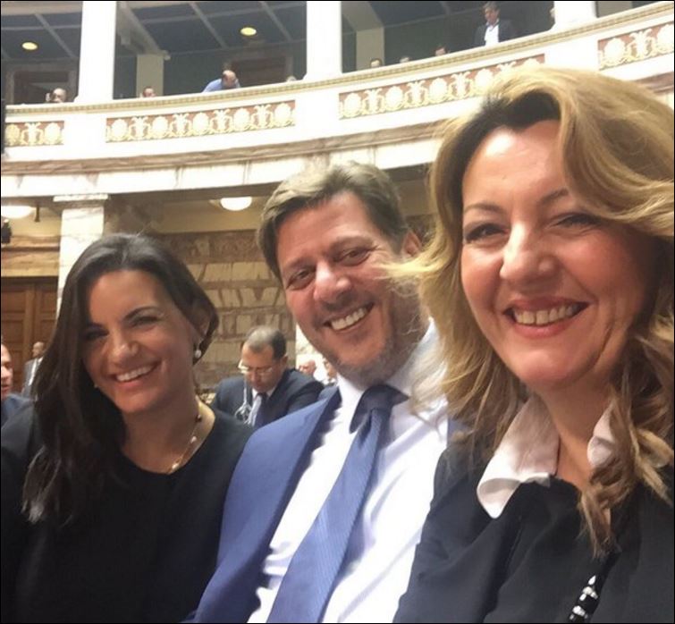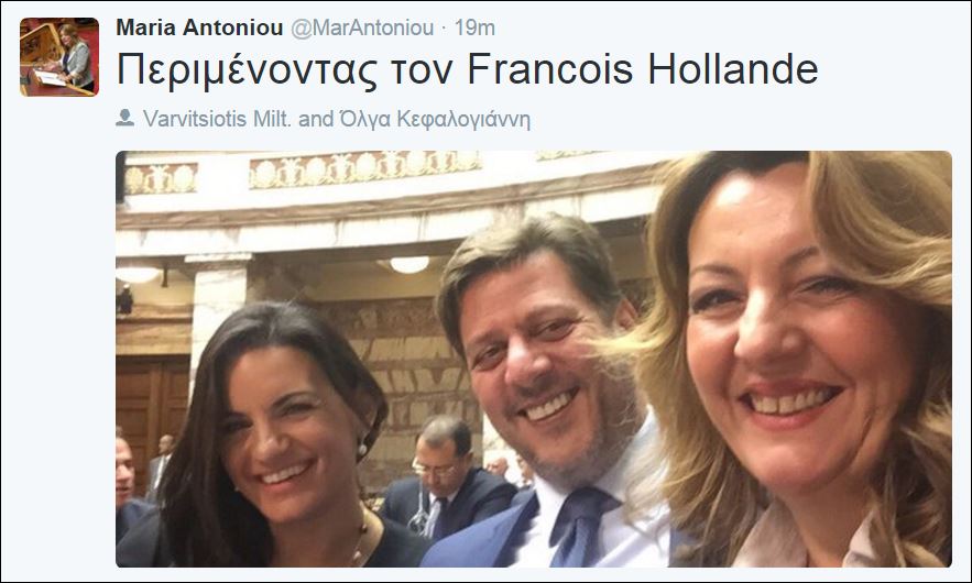 Στη φωτογραφία εμφανίζονται χαμογελαστοί οι Όλγα Κεφαλογιάννη, Μιλτιάδης Βαρβιτσιώτης και η κ. Αντωνίου, η οποία συνόδευσε τη φωτογραφία με το σχόλιο «Περιμένοντας τον Φρανσουά Ολάντ».