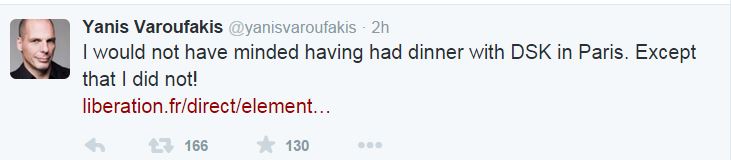Πάντως ο κ. Βαρουφάκης διέψευσε μέσω twitter την πληροφορία γράφοντας: “Δεν θα με πείραζε καθόλου να δειπνήσω με τον DSK στο Παρίσι. Αλλά δεν το έκανα!”