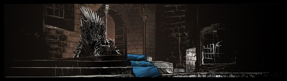 Η σημαία της Ευρωπαϊκής Ένωσης μπροστά στον άδειο Σιδηρούν Θρόνο για τον οποίο έχει χυθεί πολύ αίμα. Όλοι τον θέλουν ωστόσο όποιος κάθεται… πεθαίνει!