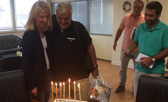 Στη φωτογραφία εικονίζεται με την Περιφερειάρχη Αττικής, Ρένα Δούρου, την ώρα που σβήνει τα κεριά της τούρτας των γενεθλίων του.