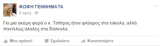 Συγκεκριμένα, η Φώφη Γεννηματά, έγραψε: «Για μια ακόμη φορά ο κ. Τσίπρας ήταν φλύαρος στα εύκολα, αλλά παντελώς άλαλος στα δύσκολα».