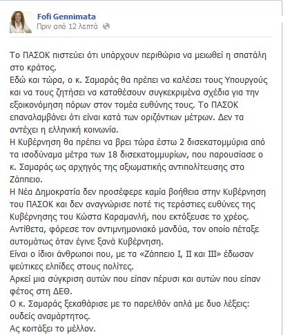 «Η Νέα Δημοκρατία και ο κ. Σαμαράς έδωσαν ψεύτικες ελπίδες» τονίζει, μεταξύ άλλων, η Φώφη Γεννηματά.Η δήλωση της κ. Γεννηματά:«Το ΠΑΣΟΚ πιστεύει ότι υπάρχουν περιθώρια να μειωθεί η σπατάλη στο κράτος.Εδώ και τώρα, ο κ. Σαμαράς θα πρέπει να καλέσει τους Υπουργούς και να τους ζητήσει να καταθέσουν συγκεκριμένα σχέδια για την εξοικονόμηση πόρων στον τομέα ευθύνης τους. Το ΠΑΣΟΚ επαναλαμβάνει ότι είναι κατά των οριζόντιων μέτρων. Δεν τα αντέχει η ελληνική κοινωνία.H Κυβέρνηση θα πρέπει να βρει τώρα έστω 2 δισεκατομμύρια από τα ισοδύναμα μέτρα των 18 δισεκατομμυρίων, που παρουσίασε ο κ. Σαμαράς ως αρχηγός της αξιωματικής αντιπολίτευσης στο Ζάππειο.Η Νέα Δημοκρατία δεν προσέφερε καμία βοήθεια στην Κυβέρνηση του ΠΑΣΟΚ και δεν αναγνώρισε ποτέ τις τεράστιες ευθύνες της Κυβέρνησης του Κώστα Καραμανλή, που εκτόξευσε το χρέος. Αντίθετα, φόρεσε τον αντιμνημονιακό μανδύα, τον οποίο πέταξε αυτομάτως όταν έγινε ξανά Κυβέρνηση.Είναι ο ίδιοι άνθρωποι που, με τα «Ζάππειο Ι, ΙΙ και ΙΙΙ» έδωσαν ψεύτικες ελπίδες στους πολίτες. Αρκεί μια σύγκριση αυτών που είπαν πέρυσι και αυτών που είπαν φέτος στη ΔΕΘ. Ο κ. Σαμαράς ξεκαθάρισε με το παρελθόν απλά με δυο λέξεις: ουδείς αναμάρτητος.