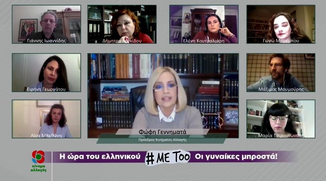 Το Κίνημα Αλλαγής διοργάνωσε το απόγευμα της Κυριακής διαδικτυακή εκδήλωση «για το Ελληνικό #metoo.Οι γυναίκες μπροστά» με αφορμή την 8η Μαρτίου, την Ημέρα της Γυναίκας. Η πρόεδρος του κόμματος, Φώφη Γεννηματά, με ομιλία της οποίας άνοιξε η εκδήλωση ανέφερε πως η υπόθεση του metoo πρέπει να ενθαρρυνθεί, ώστε να φέρει αποτέλεσμα. «Να αποθαρρύνουμε όσους αρέσκονται στην εξουσιαστική βία, να γνωρίζουν ότι θα έχουν συνέπειες, ότι θα τιμωρηθούν. Να ενθαρρύνουμε τις γυναίκες, αλλά και όλα τα θύματα να μιλούν, να καταγγέλλουν. Καμία σιωπή και καμία ανοχή σε αυτές τις πρακτικές. Σε όλους τους χώρους, στον πολιτισμό, στον αθλητισμό, στα Πανεπιστήμια, στους χώρους εργασίας, στην γειτονιά μας», σημείωσε η κα. Γεννηματά και τόνισε: «Από εδώ και πέρα το να σπάσουμε τη σιωπή δεν είναι μόνο επιλογή, είναι ευθύνη. Εμείς οι γυναίκες πρέπει να μπούμε μπροστά. Έχουμε μια μεγάλη ευκαιρία, να ξεριζώσουμε μια φρικτή εκδοχή της ανισότητας και να αγωνιστούμε μαζί με τους άνδρες που το αντιλαμβάνονται, για δικαιοσύνη, αλληλοσεβασμό, αλληλεγγύη, ισότητα, για την πραγματική δημοκρατία».