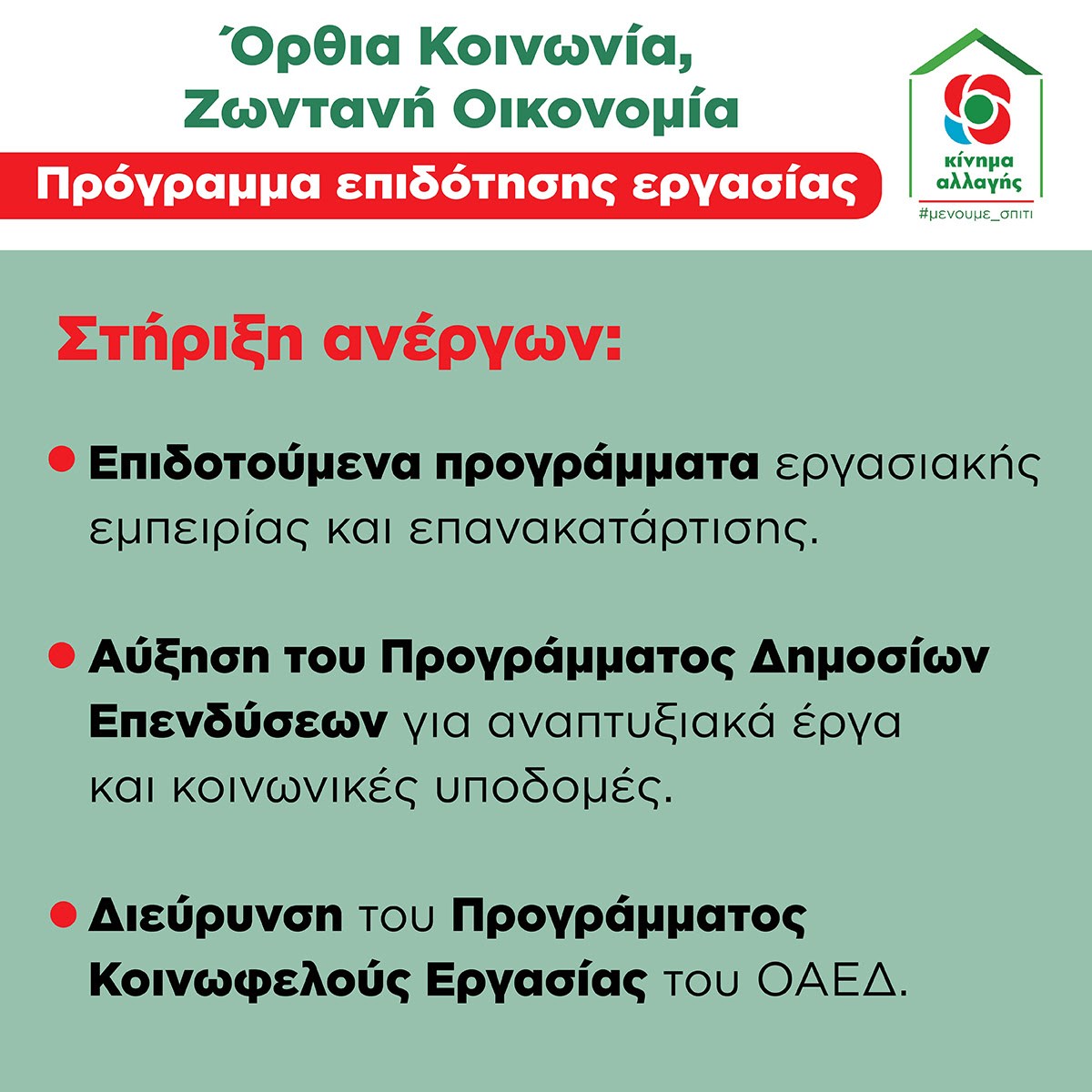 - μεγάλη διεύρυνση του Προγράμματος Κοινωφελούς Εργασίας του ΟΑΕΔ.