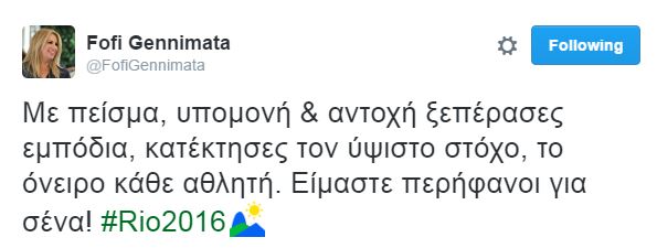 «Με πείσμα, υπομονή και αντοχή ξεπέρασες κάθε εμπόδιο, κατέκτησες τον ύψιστο στόχο, το όνειρο κάθε αθλητή και αθλήτριας. Είμαστε περήφανοι για σένα» αναφέρεται σε ανάρτηση της προέδρου του ΠΑΣΟΚ Φ. Γεννηματά στο twitter.
