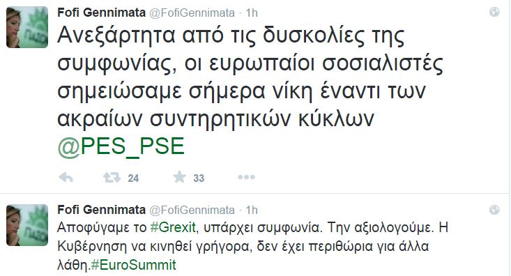 Ανεξάρτητα από τις δυσκολίες της συμφωνίας, οι ευρωπαίοι σοσιαλιστές σημειώσαμε σήμερα νίκη έναντι των ακραίων συντηρητικών κύκλων», έγραψε η πρόεδρος του ΠΑΣΟΚ.