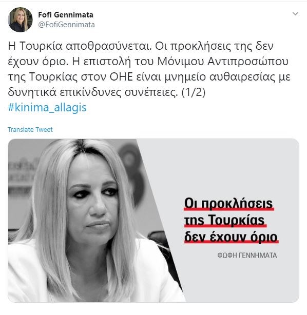 «Η Τουρκία αποθρασύνεται. Οι προκλήσεις της δεν έχουν όριο. Η επιστολή του Μόνιμου Αντιπροσώπου της Τουρκίας στον ΟΗΕ είναι μνημείο αυθαιρεσίας με δυνητικά επικίνδυνες συνέπειες», σχολίασε η πρόεδρος του Κινήματος Αλλαγής Φώφη Γεννηματά με ανάρτησή της στο twitter.