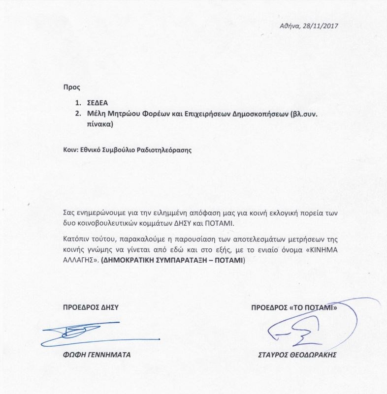 Στην επιστολή αναφέρουν ότι «σας ενημερώνουμε για την ειλημμένη απόφαση μας για κοινή εκλογική πορεία των δυο κοινοβουλευτικών κομμάτων ΔΗΣΥ και ΠΟΤΑΜΙ. Κατόπιν τούτου, παρακαλούμε η παρουσίαση των αποτελεσμάτων μετρήσεων της κοινής γνώμης να γίνεται από εδώ και στο εξής, με το ενιαίο όνομα «ΚΙΝΗΜΑ ΑΛΛΑΓΗΣ». (ΔΗΜΟΚΡΑΤΙΚΗ ΣΥΜΠΑΡΑΤΑΞΗ – ΠΟΤΑΜΙ)».