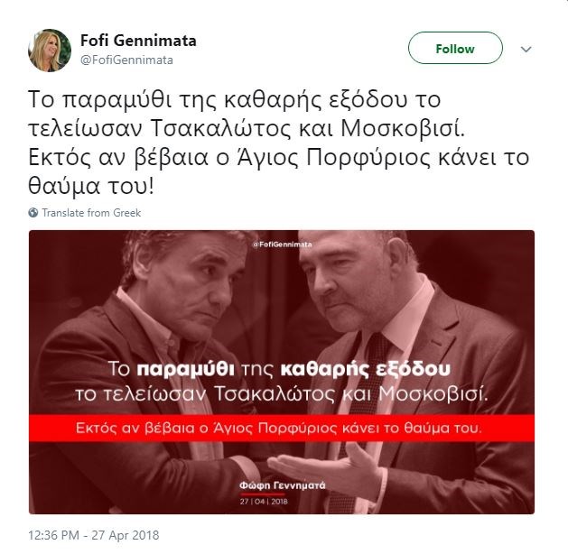 Με αιχμηρή δήλωση σχολίασε η Φώφη Γεννηματά την άποψη της κυβέρνησης περί καθαρής εξόδου από το μνημόνιο. «Το παραμύθι της καθαρής εξόδου, το τελείωσαν Τσακαλώτος και Μοσκοβισί. Εκτός αν βέβαια ο Άγιος Πορφύριος κάνει το θαύμα του», τόνισε η επικεφαλής του Κινήματος Αλλαγής.