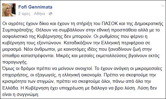 «Οι αγρότες έχουν δίκιο και έχουν τη στήριξη του ΠΑΣΟΚ και της Δημοκρατικής Συμπαράταξης. Θέλουν να συμβάλλουν στην εθνική προσπάθεια, αλλά με το ασφαλιστικό της κυβέρνησης δεν μπορούν. Οι ρυθμίσεις που φέρνει η κυβέρνηση τούς εξοντώνουν. Καταδικάζουν την ελληνική περιφέρεια σε μαρασμό. Νέοι άνθρωποι, με καινοτόμες ιδέες που ξαναδίνουν ζωή στην ύπαιθρο καταστρέφονται. Μικρές και μεσαίες εκμεταλλεύσεις βγαίνουν εκτός παραγωγής. Όμως οι δρόμοι πρέπει να μείνουν ανοιχτοί. Το έχουν ανάγκη οι μικρομεσαίες επιχειρήσεις, οι εξαγωγείς, η ελληνική οικονομία. Πρέπει να σκεφτούμε την κρισιμότητα των στιγμών, πρέπει να σκεφτούμε όλοι, πάνω από όλα την Ελλάδα. Η κυβέρνηση έχει υποχρέωση με διάλογο να βρει λύση. Λύση δεν είναι η συγγνώμη», τονίζει η πρόεδρος του ΠΑΣΟΚ.