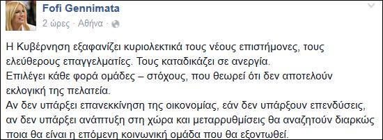Σε ό,τι αφορά τις κινητοποιήσεις των ελευθέρων επαγγελματιών αναφέρει: «Η κυβέρνηση εξαφανίζει κυριολεκτικά τους νέους επιστήμονες, τους ελεύθερους επαγγελματίες. Τους καταδικάζει σε ανεργία. Επιλέγει κάθε φορά ομάδες – στόχους, που θεωρεί ότι δεν αποτελούν εκλογική της πελατεία. Αν δεν υπάρξει επανεκκίνηση της οικονομίας, εάν δεν υπάρξουν επενδύσεις, αν δεν υπάρξει ανάπτυξη στη χώρα και μεταρρυθμίσεις θα αναζητούν διαρκώς ποια θα είναι η επόμενη κοινωνική ομάδα που θα εξοντωθεί».