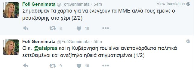 Η κ. Γεννηματά έγραψε: «Ο κ. Τσίπρας και η κυβέρνησή του είναι ανεπανόρθωτα πολιτικά εκτεθειμένοι και ανεξίτηλα ηθικά στιγματισμένοι. Σημάδεψαν τα χαρτιά για να ελέγξουν τα ΜΜΕ αλλά τους έμεινε ο μουτζούρης στο χέρι».