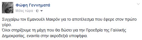 «Συγχαίρω τον Εμανουέλ Μακρόν για το αποτέλεσμα που έφερε στον πρώτο γύρο. Όλοι στηρίζουμε τη μάχη που θα δώσει για την Προεδρία της Γαλλικής Δημοκρατίας, ενάντια στην ακροδεξιά υποψήφια».
