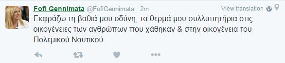 «Εκφράζω τη βαθιά μου οδύνη, τα θερμά μου συλλυπητήρια στις οικογένειες των ανθρώπων που χάθηκαν και στην οικογένεια του Πολεμικού Ναυτικού», έγραψε στο Twitter η κυρία Γεννηματά.