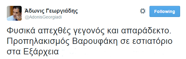 “Φυσικά απεχθές γεγονός και απαράδεκτο. Προπηλακισμός Βαρουφάκη σε εστιατόριο στα Εξάρχεια” έγραψε χαρακτηριστικά ο κοινοβουλευτικός εκπρόσωπος της Νέας Δημοκρατίας, Άδωνις Γεωργιάδης, για τον προπηλακισμό που δέχθηκε στα Εξάρχεια, ο υπουργός Οικονομικών, Γιάνης Βαρουφάκης και η σύζυγός του.