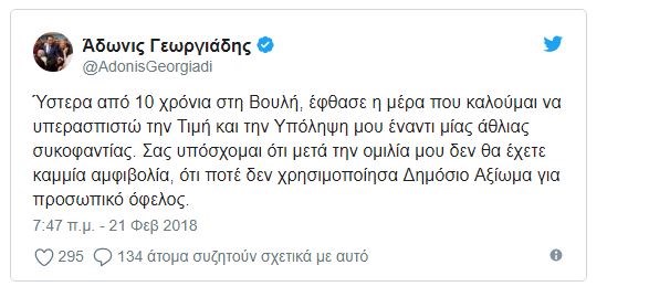«Ύστερα από 10 χρόνια στη Βουλή, έφθασε η μέρα που καλούμαι να υπερασπιστώ την Τιμή και την Υπόληψη μου έναντι μίας άθλιας συκοφαντίας. Σας υπόσχομαι ότι μετά την ομιλία μου δεν θα έχετε καμμία αμφιβολία, ότι ποτέ δεν χρησιμοποίησα Δημόσιο Αξίωμα για προσωπικό όφελος», έγραψε στο tweet του ο κ. Γεωργιάδης.