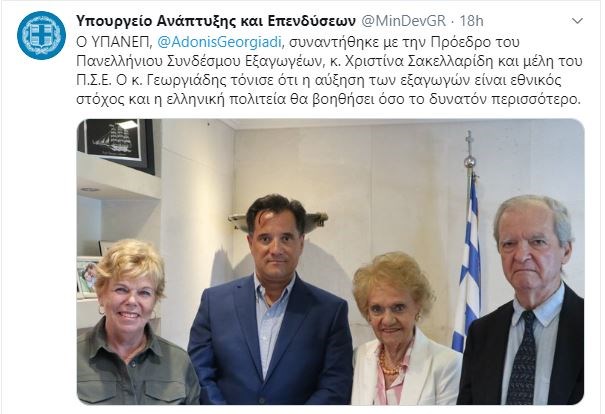Συνάντηση είχε ο Υπουργός Ανάπτυξης και Επενδύσεων, Άδωνις Γεωργιάδης, με την πρόεδρο του Πανελλήνιου Συνδέσμου Εξαγωγέων, Χριστίνα Σακελλαρίδη, και μέλη του ΠΣΕ.