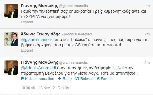 Για να δείτε τον χθεσινό διάλογο Γεωργιάδη-Μανώλη στο twitter πατήστε εδώ
