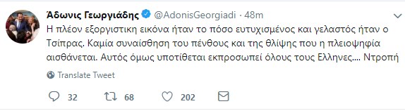 “Η πλέον εξοργιστικη εικόνα ήταν το πόσο ευτυχισμένος και γελαστός ήταν ο Τσίπρας. Καμία συναίσθηση του πένθους και της θλίψης που η πλειοψηφία αισθάνεται. Αυτός όμως υποτίθεται εκπροσωπεί όλους τους Ελληνες…. Ντροπή” ανέφερε σε μια δεύτερη ανάρτησή του.