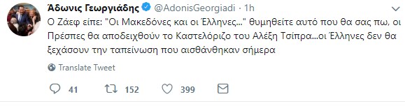 “Ο Ζάεφ είπε: “Οι Μακεδόνες και οι Έλληνες…” θυμηθείτε αυτό που θα σας πω, οι Πρέσπες θα αποδειχθούν το Καστελλόριζο του Αλέξη Τσίπρα…οι Έλληνες δεν θα ξεχάσουν την ταπείνωση που αισθάνθηκαν σήμερα” έγραψε στον προσωπικό του λογαριασμό.
