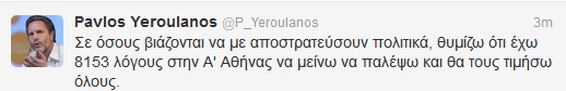 Την απάντησή του, σε όσους πιστεύουν ότι θα μείνει εκτός πολιτικής, δίνει ο Παύλος Γερουλάνος, μέσω twitter.