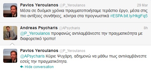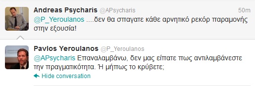 Μέσω Twitter “τσακώθηκαν” ο υπουργός Πολιτισμού Παύλος Γερουλάνος και ο υποψήφιος βουλευτής με τη ΝΔ, Ανδρέας Ψυχάρης. Όλα ξεκίνησαν από μια ανάρτηση του κ. Γερουλάνου στις 29 Μαρτίου ο οποίος έγραψε: “Μέσα σε δυόμισι χρόνια πραγματοποιήσαμε τεράστιο έργο, μέσα στις πιο αντίξοες συνθήκες, κόντρα στα προγνωστικά”. Πριν από μερικές ώρες ο κ. Ψυχάρης απάντησε στον υπουργό Πολιτισμού: “προφανώς αντιλαμβάνεστε την πραγματικότητα με διαφορετικό τροπο!”, με τον Παύλο Γερουλάνο να ανταπαντά: “Κύριε Ψυχάρη, αδημονώ να μάθω πως αντιλαμβάνεστε εσείς την πραγματικότητα”. “….δεν θα σπαγατε κάθε αρνητικό ρεκόρ παραμονής στην εξουσία!” έγραψε στη συνέχεια ο Ανδρέας Ψυχάρης. Ο κ. Γερουλάνος, αντεπιτέθηκε : “Επαναλαμβάνω, δεν μας είπατε πως αντιλαμβάνεστε την πραγματικότητα. Ή μήπως το κρύβετε;”. Να αναμένουμε συνέχεια;