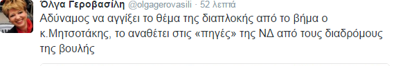 Με ανάρτησή της, στον προσωπικό της λογαριασμό στο twitter, η κυβερνητική εκπρόσωπος, Όλγα Γεροβασίλη, χαρακτήρησε τον κ. Μητσοτάκη «αδύναμο να αγγίξει το θέμα της διαπλοκής».