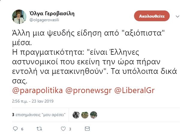 «Άλλη μια ψευδής είδηση από “αξιόπιστα” μέσα. Η πραγματικότητα: “είναι Έλληνες αστυνομικοί που εκείνη την ώρα πήραν εντολή να μετακινηθούν”. Τα υπόλοιπα δικά σας» αναφέρει η κ. Γεροβασίλη.