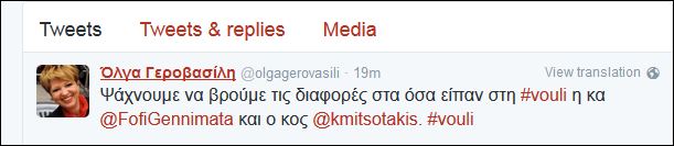 «Ψάχνουμε να βρούμε τις διαφορές στα όσα είπαν στη Βουλή η κυρία Γεννηματά και ο κύριος Μητσοτάκης»: αυτό ήταν το σχόλιο που ανήρτησε στον προσωπικό της λογαριασμό στο twitter η κυβερνητική εκπρόσωπος Όλγα Γεροβασίλη αναφερόμενη στις ομιλίες της προέδρου του ΠΑΣΟΚ και επικεφαλής της Δημοκρατικής Συμπαράταξης και του προέδρου της Νέας Δημοκρατίας.