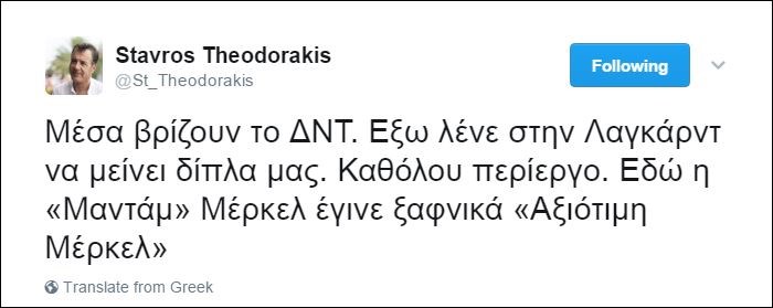 Για διγλωσσία κατηγορεί τον Αλέξη Τσίπρα, ο επικεφαλής του Ποταμιού, Σταύρος Θεοδωράκης με αφορμή όσα είπε η Κριστίν Λαγκάρντ ότι ο Πρωθυπουργός ζήτησε από το ΔΝΤ να δεσμευτεί δίπλα στην Ελλάδα.«Μέσα βρίζουν το ΔΝΤ. Έξω λένε στην Λαγκάρντ να μείνει δίπλα μας. Καθόλου περίεργο. Εδώ η ”Μαντάμ” Μέρκελ έγινε ξαφνικά ”Αξιότιμη Μέρκελ”» σχολίασε ο κ. Θεοδωράκης μέσα από τον προσωπικό του λογαριασμό στο twitter.Δείτε την ανάρτηση: