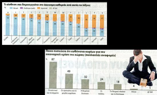 – Σε ό,τι αφορά τις ευθύνες πολιτικών (87%) και κομμάτων, για την οικονομική κρίση το υψηλότερο ποσοστό προέρχεται από ψηφοφόρους της ΔΗΜΑΡ, κόμμα που μετέχει στη σημερινή κυβέρνηση και το χαμηλότερο από εκείνους που ψήφισαν ΚΚΕ κατά τις τελευταίες εκλογές. Η άποψη αυτή βρίσκει έδαφος κυρίως στις γυναίκες στις ηλικίες των 35-44 ετών και 55-64 ετών, στους εργάτες, στους μικρομεσαίους και στους αγρότες και λιγότερο σε όσους ανήκουν στην ανώτερη τάξη. Τη μεγαλύτερη στήριξη στην κυβέρνηση δίνουν οι ψηφοφόρου του ΠΑΣΟΚ (61%).