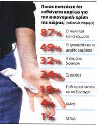 Την ευθύνη στους πολιτικούς και στα κόμματα ρίχνει η συντριπτική πλειοψηφία των πολιτών (87%) για την οικονομική κρίση στη χώρα μας, όπως προκύπτει από το δεύτερο μέρος της έρευνας της «Metron Analysis» που δημοσιεύει η «Ελευθεροτυπία». Παράλληλα: