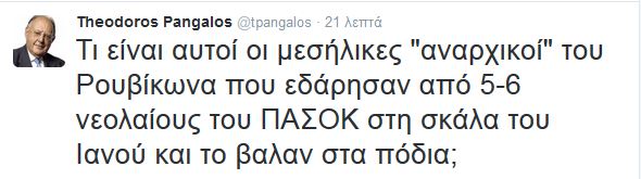 «Τι είναι αυτοί οι μεσήλικες “αναρχικοί” του Ρουβίκωνα που εδάρησαν από 5-6 νεολαίους του ΠΑΣΟΚ στη σκάλα του Ιανού και το βαλαν στα πόδια; Πέταγαν αυγά στον αέρα τα οποία, ελλείψει προοπτικής, πέφταν στα κεφάλια τους. Να σταλούν τα Χριστούγεννα ως διασκεδαστές σε οίκους ευγηρίας.
