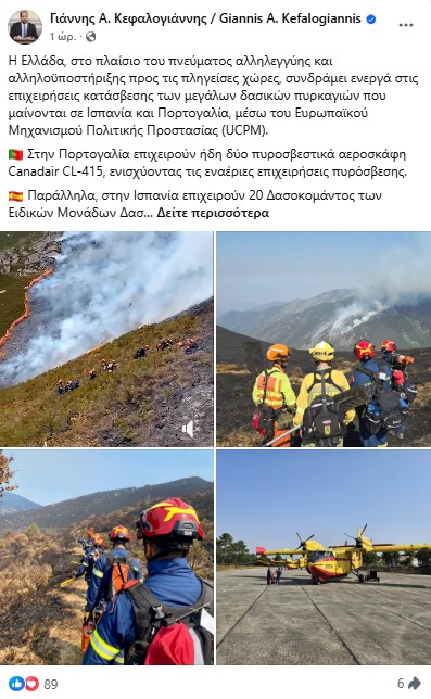 Όπως αναφέρει σε ανάρτησή του στα μέσα κοινωνικής δικτύωσης ο υπουργός Κλιματικής Κρίσης και Πολιτικής Προστασίας, Γιάννης Κεφαλογιάννης, στην Πορτογαλία επιχειρούν ήδη δύο πυροσβεστικά αεροσκάφη Canadair CL-415 ενώ στην Ισπανία 20 δασοκομάντος των Ειδικών Μονάδων Δασικών Επιχειρήσεων (ΕΜΟΔΕ). Όπως τονίζει ο κ. Κεφαλογιάννης, τόσο τα Canadair, όσο και η ομάδα της ΕΜΟΔΕ, θα παραμείνουν στις περιοχές αυτές έως τις 28 Αυγούστου, συνεχίζοντας να ενισχύουν τις επιχειρήσεις κατάσβεσης.