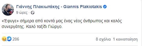 “«Έφυγε» σήμερα από κοντά μας ένας νέος άνθρωπος και καλός συνεργάτης. Καλό ταξίδι Γιώργο.”, έγραψε σε ανάρτηση στον προσωπικό λογαριασμό του στο Facebook o υπουργός Ναυτιλίας.
