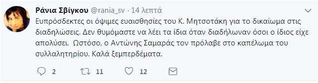“Ευπρόσδεκτες οι όψιμες ευαισθησίες του Κ. Μητσοτάκη για το δικαίωμα στις διαδηλώσεις. Δεν θυμόμαστε να λέει τα ίδια όταν διαδήλωναν όσοι ο ίδιος είχε απολύσει. Ωστόσο, ο Αντώνης Σαμαράς τον πρόλαβε στο καπέλωμα του συλλαλητηρίου. Καλά ξεμπερδέματα”, σχολίασε η Ράνια Σβίγκου, με ανάρτηση της στο twitter.