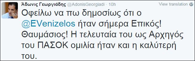 Ο Άδωνις Γεωργιάδης αποθέσωσε μέσα από το twitter τον Ευάγγελο Βενιζέλο για την χθεσινή του ομιλία στη Βουλή.