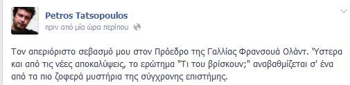 Με σχόλιο του στο Facebook, ο Πέτρος Τατσόπουλος εξέφρασε τον απεριόριστο σεβασμό του στον πρόεδρο της Γαλλίας Φρανσουά Ολάντ.