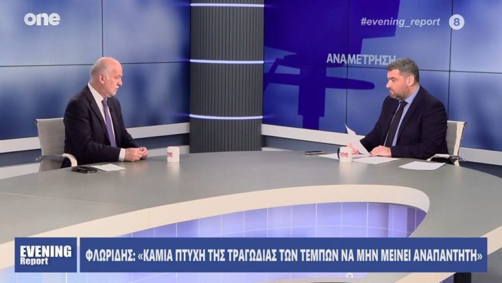 Λίγες ώρες πριν από την «μαύρη» επέτειο της τραγωδίας των Τεμπών, ο υπουργός Δικαιοσύνης, Γιώργος Φλωρίδης, μίλησε στην εκπομπή του One Channel, «Evening Report».
