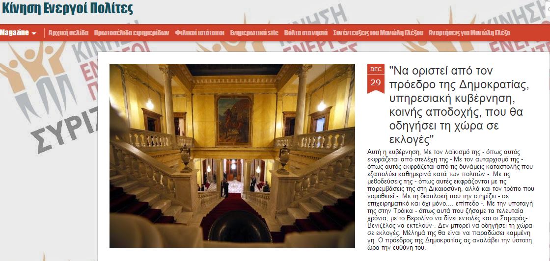 Στο ιστολόγιο «Κίνηση Ενεργών Πολιτών» που αποτελεί βήμα δημοσίου διαλόγου του ευρωβουλευτή του ΣΥΡΙΖΑ, Μανώλη Γλέζου, αναρτήθηκε η πρόταση να οριστεί υπηρεσιακή κυβέρνηση κοινής αποδοχής από τον Πρόεδρο της Δημοκρατίας καθώς, όπως αναφέρεται, « η παρούσα κυβέρνηση δεν μπορεί να οδηγήσει τη χώρα σε εκλογές».