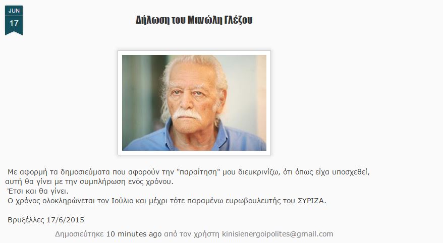 «Με αφορμή τα δημοσιεύματα που αφορούν την “παραίτηση» μου διευκρινίζω, ότι όπως είχα υποσχεθεί, αυτή θα γίνει με την συμπλήρωση ενός χρόνου», αναφέρει ο Μανώλης Γλέζος, μέσω της ιστοσελίδας της Κίνησης Ενεργοί Πολίτες του ευρωβουλευτή του ΣΥΡΙΖΑ και συνεχίζει: «Έτσι και θα γίνει».