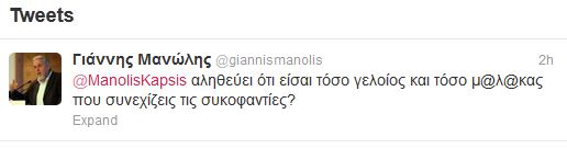Νέο μέτωπο κατά του Μανώλη Καψή άνοιξε ο Γιάννης Μανώλης.Το στέλεχος των Ανεξάρτητων Ελλήνων έδωσε μια σκληρή απάντηση στον δημοσιογράφο, ο οποίος είχε ξεσηκώσει θύελλα αντιδράσεων με αφορμή τα σχόλιά του κατά καλλιτεχνών αναφορικά με τις δηλώσεις τους στην εφορία.Ο κ. Μανώλης προχώρησε, μέσα από τον προσωπικό λογαριασμό στο Twitter, στο παρακάτω σχόλιο:«αληθεύει ότι είσαι τόσο γελοίος και τόσο μ@λ@κας που συνεχίζεις τις συκοφαντίες?»
