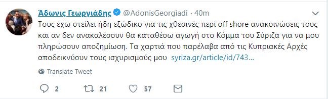 “Τους έχω στείλει ήδη εξώδικο για τις χθεσινές περί off shore ανακοινώσεις τους και αν δεν ανακαλέσουν θα καταθέσω αγωγή στο Κόμμα του ΣΥΡΙΖΑ για να μου πληρώσουν αποζημίωση. Τα χαρτιά που παρέλαβα από τις Κυπριακές Αρχές αποδεικνύουν τους ισχυρισμούς μου” έγραψε χαρακτηριστικά ο Άδωνις Γεωργιάδης.