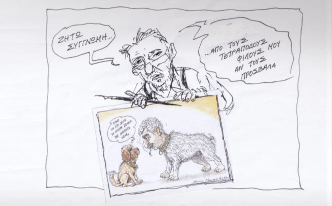 Στο σκίτσο ο Ηλίας Μακρής ζητά συγγνώμη, αλλά όχι από τον Παύλο Πολάκη. «Ζητώ συγγνώμη… από τους τετράποδους φίλους μου» αναφέρει.