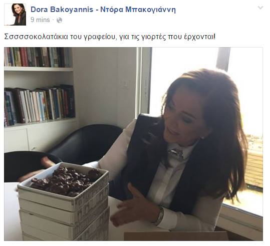 Μια φωτογραφία με κουτιά γεμάτα …σοκολατάκια πάνω στο γραφείο της ανέβασε στον λογαριασμό της στο Facebook η βουλευτής της ΝΔ, Ντόρα Μπακογιάννη.