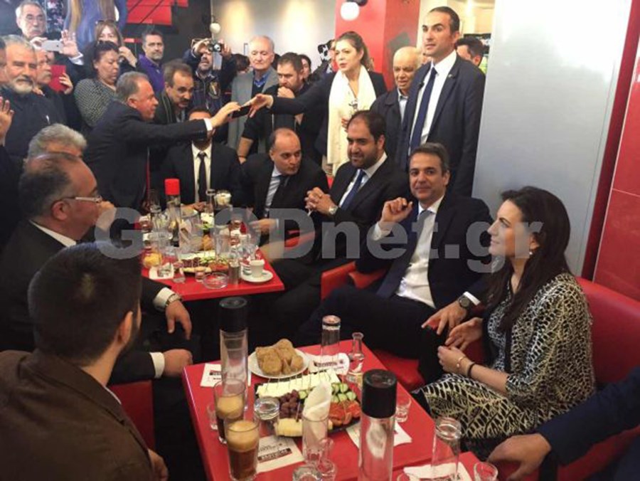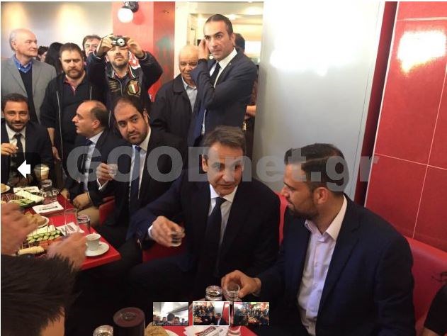 Με φίλους της Νέας Δημοκρατίας και τοπικά στελέχη συναντήθηκε αμέσως μετά την παρέλαση σε καφετέρια του Ρεθύμνου, ο Κυριάκος Μητσοτάκης.Ο Πρόεδρος της ΝΔ ήπιε τσικουδιές και άκουσε μία μαντινάδα σχετικά με τα μέτρα της κυβέρνησης.”Ο Κρητικός δεν προσκυνά, είναι σκληρός σαν πέτρα. Μην υπογράψεις πρόεδρε, του ΣΥΡΙΖΑ τα μέτρα” έλεγε η μαντινάδα.Μαζί με τον πρόεδρο της ΝΔ, ήταν οι βουλευτές Όλγα Κεφαλογιάννη και Γιάννης Κεφαλογιάννης.
