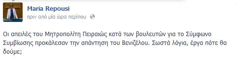 Η Μαρία Ρεπούση σχολίασε στην προσωπική της σελίδα στο Facebook την απάντηση του προέδρου του ΠΑΣΟΚ Ευάγγελου Βενιζέλου στον Μητροπολίτη Πειραιώς Σεραφείμ για το θέμα της επέκτασης του συμφώνου συμβίωσης και στα ομόφυλα ζευγάρια.