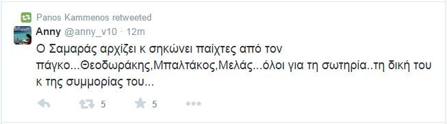 «Ο Σαμαράς αρχίζει κ σηκώνει παίχτες από τον πάγκο… Θεοδωράκης, Μπαλτάκος, Μελάς… όλοι για τη σωτηρία… τη δική του κ της συμμορίας του…»
